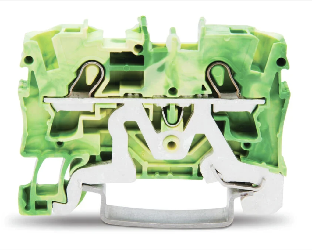 Borna de tierra para 2 conductores; 4 mm²; Apropiado para aplicaciones Ex e II; Marcaje lateral y central; para carril DIN 35 x 15 y 35 x 7,5; Push-in CAGE CLAMP®; 4,00 mm²; verde-amarillo.
